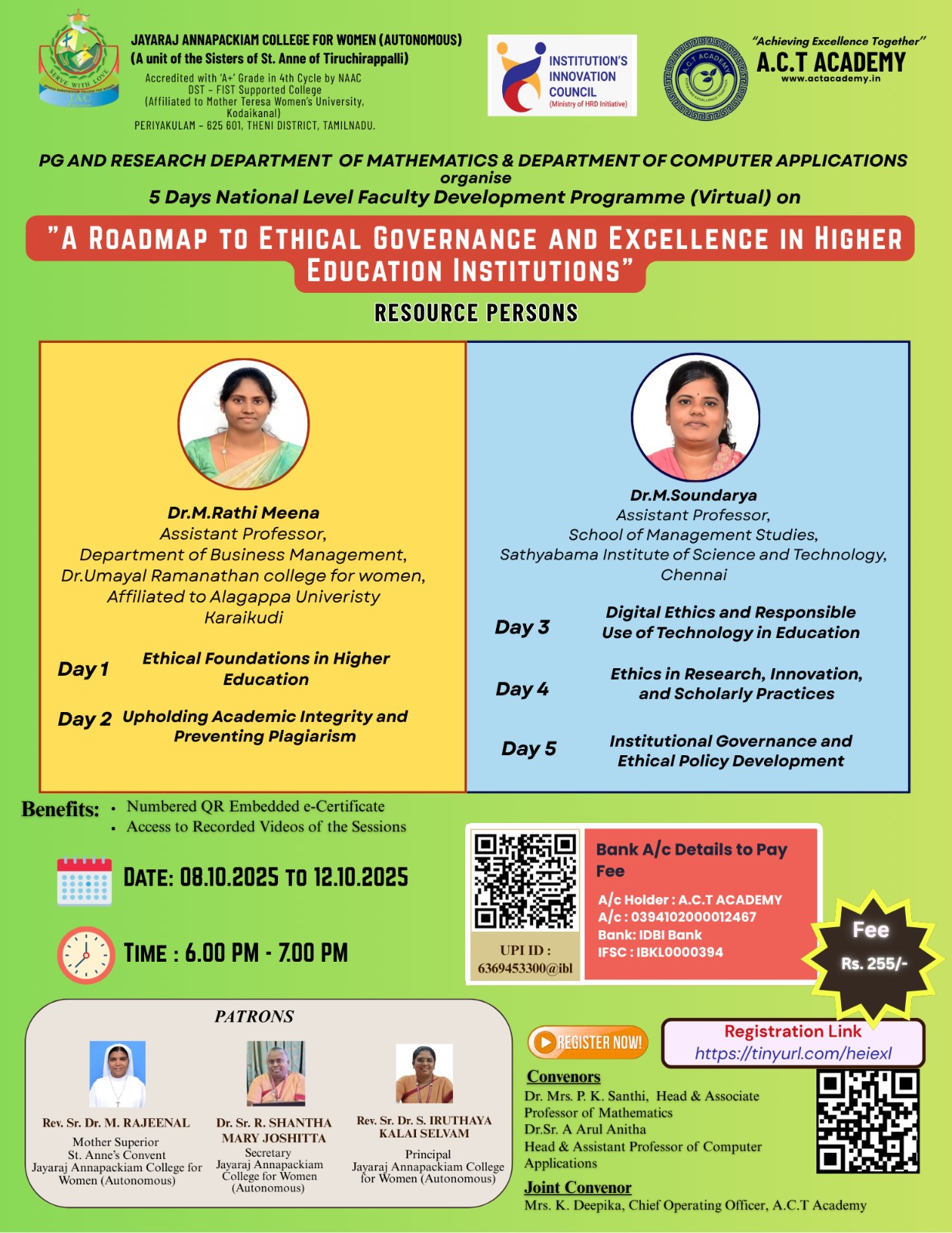End Semester Exam– 06.10.2025 to 10.10.2025 PG and Research Department of Mathematics & Department of Computer Applications, JAYARAJ ANNAPACKIAM COLLEGE FOR WOMEN (Autonomus) , Periyakulam, Theni (D.t) & A.C.T Academy conducting the 5 Days National Level FDP on “A Roadmap to Ethical Governance and Excellence in Higher Education Institutions” *(Open to all Disciplines ) –08.10.2025 Practical Examination Begins– 13.10.2025 Deepavali – 20.10.2025 Issue of Hall Ticket – 25.10.2025 Semester Exam Begins – 29.10.2025 |